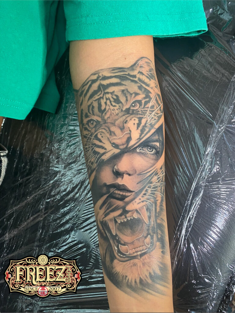 女性women’stattoosの腕sleevetattooに人気の動物animaltattooのデザインでtigerheaddresstattoodesigns虎tigertattooと女性の顔をモチーフにブラックアンドグレイタトゥーblackandgraytattooのジャンルで彫った千葉女性彫師SAOのタトゥー洋彫りtattoo作品画像。千葉タトゥーは千葉県千葉市の幕張本郷にあるタトゥースタジオ|フリーズタトゥー|FREE:Z TATTOO。