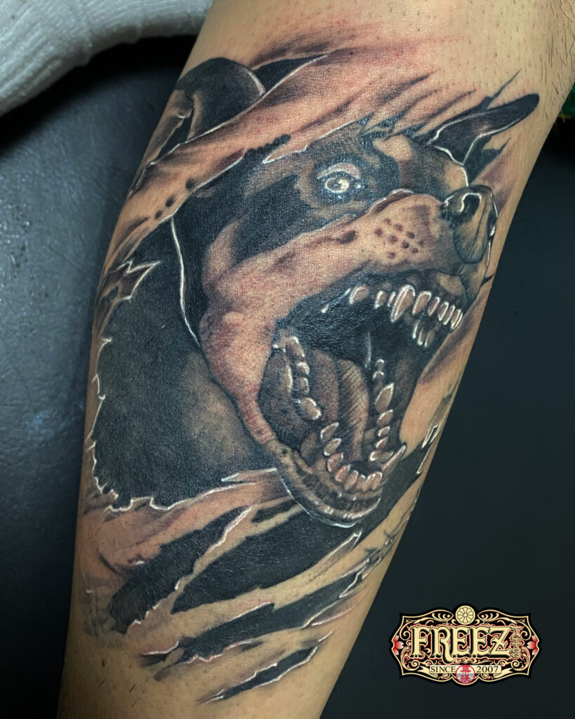 男性men’stattoosの腕sleevetattooに人気の動物animaltattooのデザインで犬dogtattooをモチーフにブラックアンドグレイタトゥーblackandgraytattooのジャンルで彫ったタトゥー洋彫りtattoo作品画像。千葉タトゥーは千葉県千葉市の幕張本郷にあるタトゥースタジオ|フリーズタトゥー|FREE:Z TATTOO。