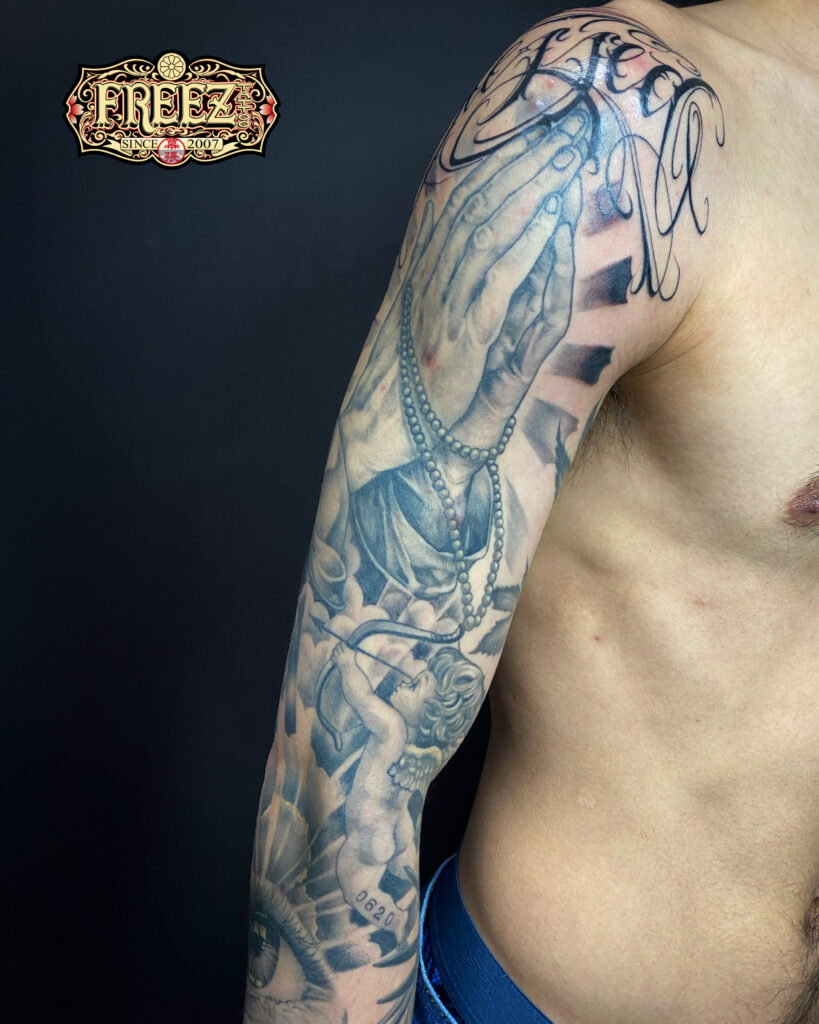 religiontattooのデザインで合掌playhandtattooプレイハンドタトゥーをモチーフにブラックアンドグレイタトゥーblackandgraytattooのジャンルで彫ったタトゥー洋彫りtattoo作品画像。千葉タトゥーは千葉県千葉市の幕張本郷にあるタトゥースタジオ|フリーズタトゥー|FREE:Z TATTOO。